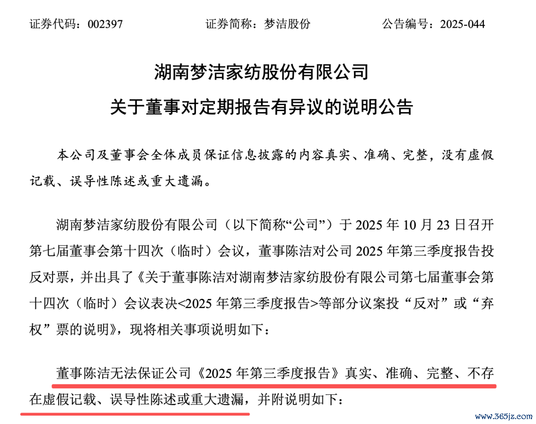 行政监管措施决定书还载明:2022年至2024年度,公司直营专柜、子公司福建大方睡眠科技股份有限公司直销业务收入和成本存在跨期确认情形,公司销售返利存在跨期冲减营业收入情形,职工薪酬及社保存在跨期计提情形。陈洁指出,针对上述事项,公司在《2025年第三季度报告》中并未予以调整和处理,导致相关财务数据失真、缺乏可信度,存在虚假记载和误导性陈述,因此其投出“反对”票。
